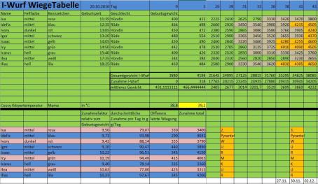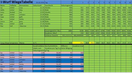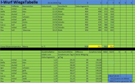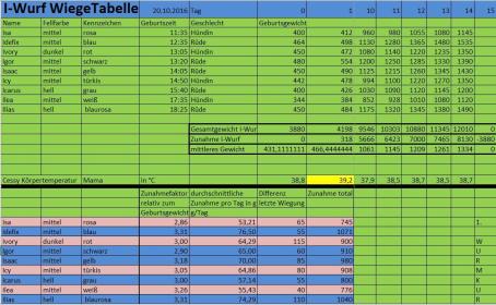 "Ilea" bei den Hündinnen und "Isaac" bei den Rüden führen derzeit die Zunahme Tabelle an. Ilea hat ihren Nachteil den sie mit ihren 344g bei Geburt hatte schon fast weggenuckelt!