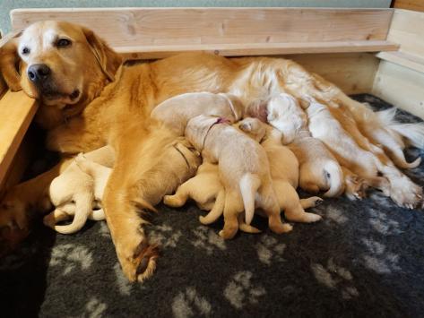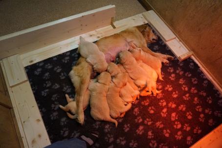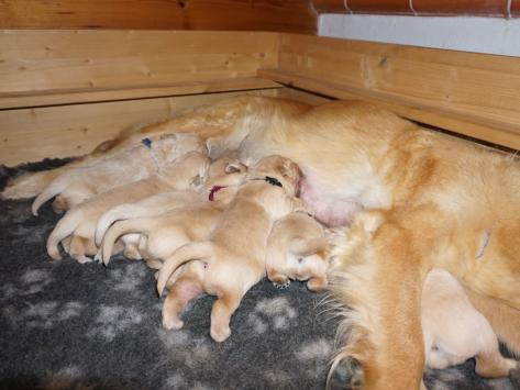 Am vierten Tag sind unsere I´s dem Alter entsprechend munter und fit! Die rasante Gewichtszunahme ist für mich immer wieder erstaunlich und ist ein Wunder der Natur. Binnen vier Tagen hat unser I-Wurf über 2kg an Gewicht zugenommen und dies ganz allein durch die Ernährung über die Muttermilch von Cessy. Wenn man bedenkt, dass Cessy selbst nur 28kg wiegt ist das eine erstaunliche Leistung. Dementsprechend fordert Cessy natürlich Futter - sie bekommt jetzt alle drei bis vier Stunden Tag und Nacht eine Ration bestes Welpenfutter und Extras wie gebratene Hühnerhälse und Wings ... auch Speck, Pansen und für zwischendurch kanns auch mal ne Bockwurst sein um den unglaublichen Kalorienbedarf zu decken. Ab nächster Woche werden wir die Kleinen aber schon mit Ziegenmilch zufüttern, weil selbst Cessy irgendwann die Grenze des machbaren erreicht und ohne Hilfe würde die fehlende Energie aus ihrem Körper abgebaut werden und das wollen wir möglichst vermeiden.