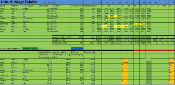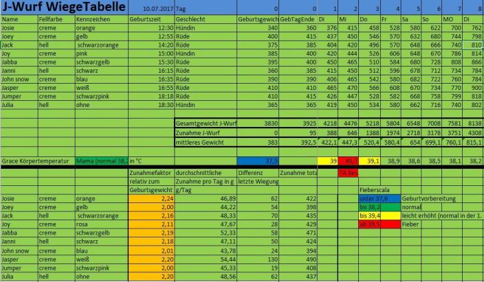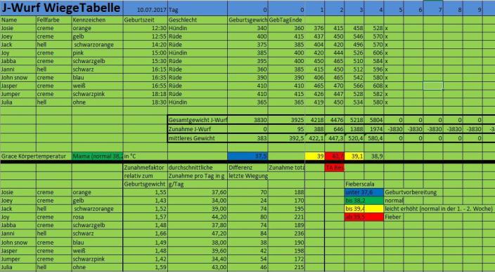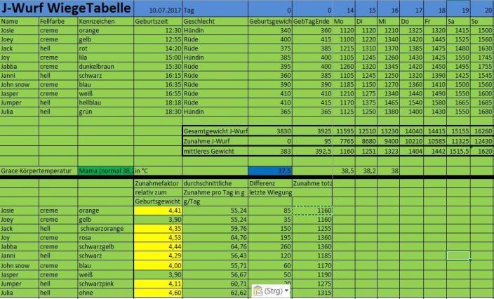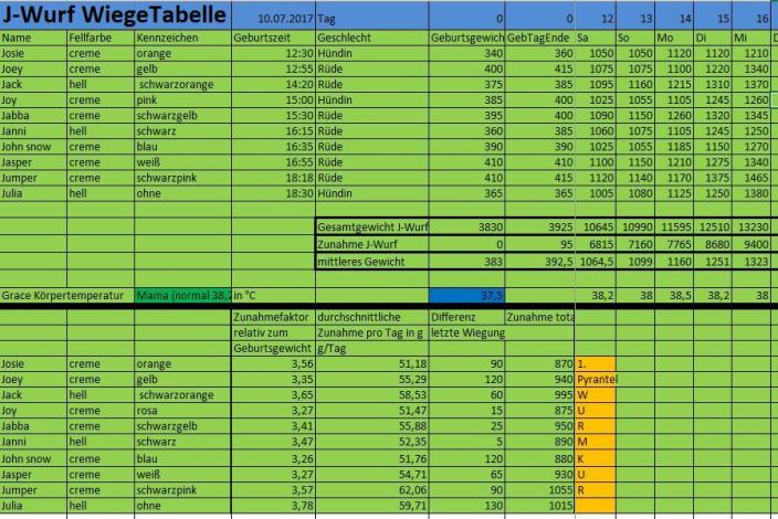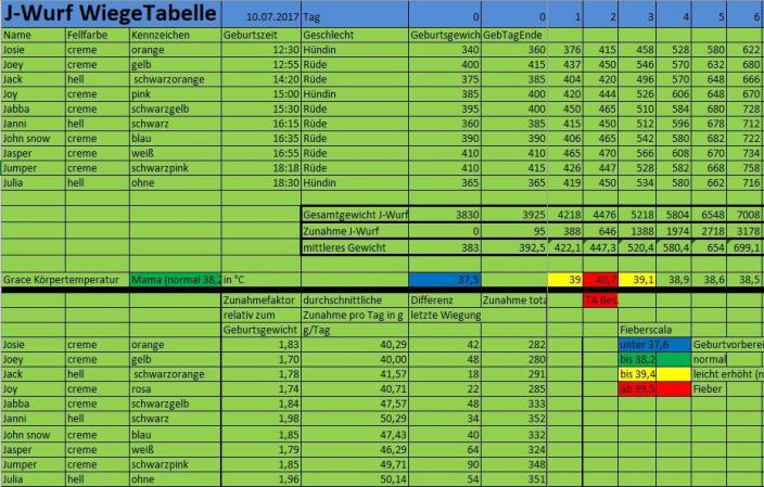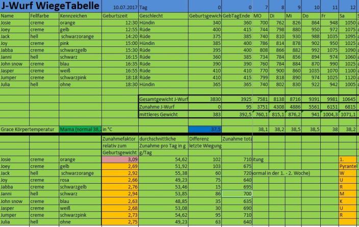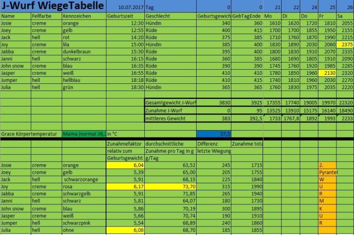 Wow unser J-Wurf ist heute am 17.07. eine Woche alt geworden und hat bereits sein Gewicht verdoppelt! Joy hat heute die Gunst der Stunde genutzt, da irgendwie alle recht verschlafen waren und hat Mama Grace am Morgen ganz alleine beansprucht. Man mußte sie vorsichtig anfassen, man hatte irgendwie das Gefühl sie könnte platzen :-)! Es haben zwar letztendlich nur die Hälfte den Faktor 2 erreicht, aber bei den anderen fehlt nicht mehr viel. Erstaunlich ist auch, das bei den J´s die Hündinnen (fast) besser saugen als die Rüden! Die Hündinnen sind alle drei ganz vorne dabei im Nuckelwettkampf! Letztendlich ist es ein wirklich wunderbar ausgeglichener Wurf, wo keiner einen großen Abstand zum anderen hat, somit hat jeder die gleichen Chancen sich prima zu entwickeln.