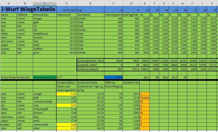 ... unsere J´s sind jetzt ins Welpenhaus umgezogen und genießen die neu erlangte Bewegungsfreiheit. Grace schaut natürlich regelmäßig nach dem Rechten und hält auf Distanz Tag und Nacht Wache. Seit ein paar Tagen bekommen sie jetzt auch schon ein Breichen aus Kartoffeln, Hackfleisch, Karotten und Ziegenmilch. ... es scheint ihnen zu schmecken, wie man heute eindeutig an der Gewichtstabelle erkennen kann.