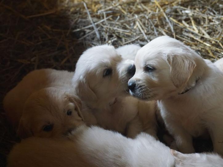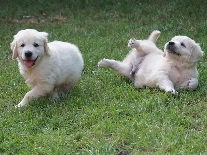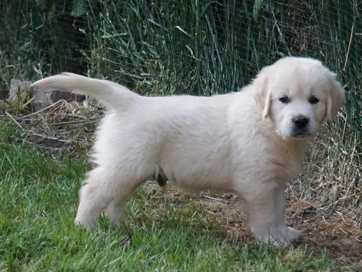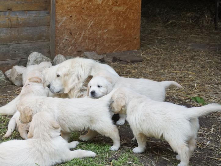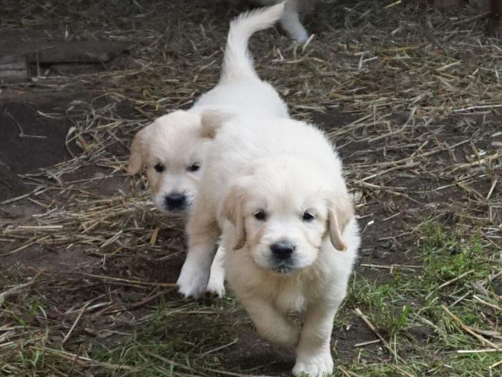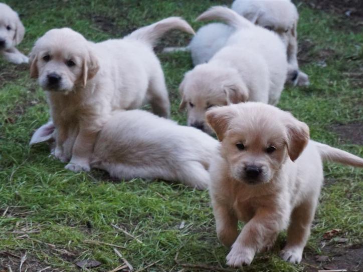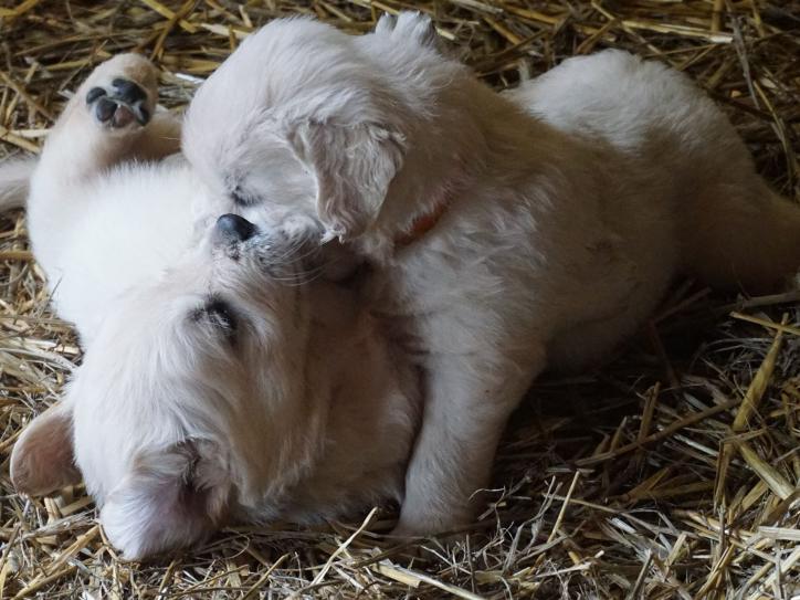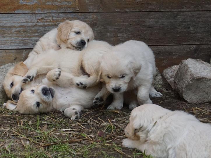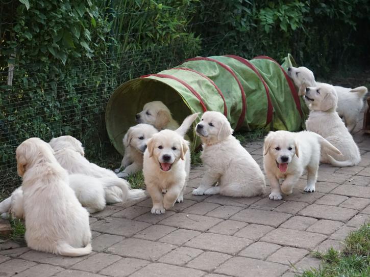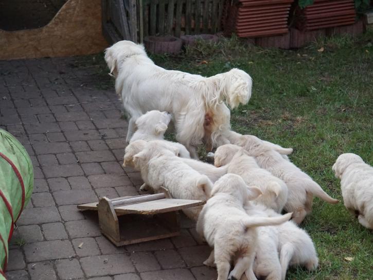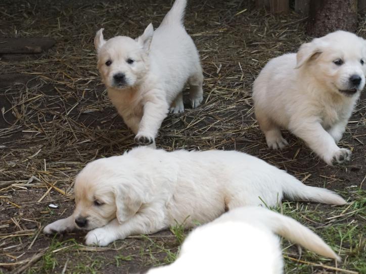 ....mit knapp 7 Wochen sind unsere J´s voll aktiv und strotzen nur so vor Lebensfreude. Jeder unserer 10 kleinen Goldilein ist zu einem gesunden Hund herangewachsen .... es ist eine Freude der Rasselbande beim Spiel zuzusehen. Mittlerweile sind sie groß genug und dürfen ihrem Bewegungsdrang auch auf der großen Wiese freien Lauf lassen.