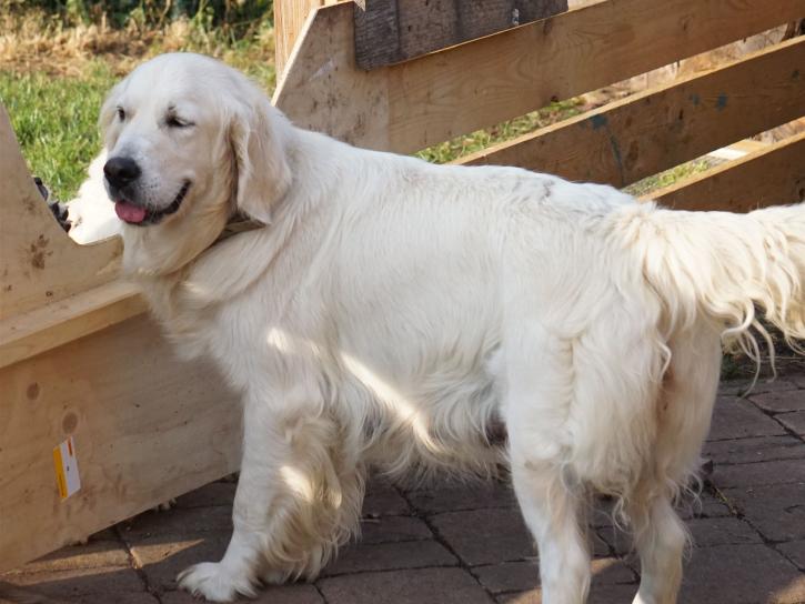 Nach kurzer Zeit hat sich schon herausgestellt das dies genau die richtige Entscheidung war. Sie hatte sich zu einer Hündin mit einer traumhaften Erscheinung entwickelt. Das sehr helle cremefarbene Haarkleid mit üppigem Behang, der wohlgeformte Kopf und der insgesamt gut bemuskelte Körperbau macht sie zu einer Golden Retriever Hündin, der ihrer Rasse alle Ehre macht und wie man sie nur sehr selten findet. Sie wurde bereits auf mehreren Ausstellungen ausnahmslos mit vorzüglich bewertet und hat bereits mehrere CACIB Anwartschaften.